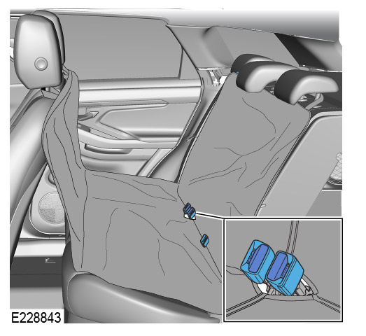 Open the second row seat - protective cover against the second row seat backrest as illustrated. Pass the head restraint straps over the top of the 2 second row head restraints as illustrated.