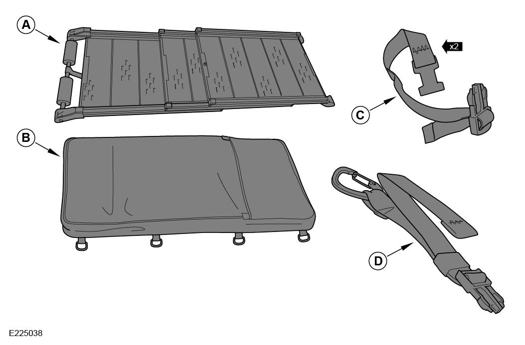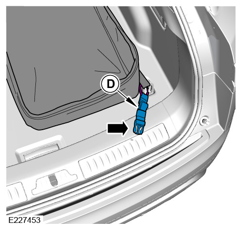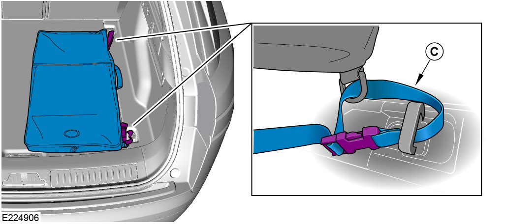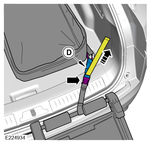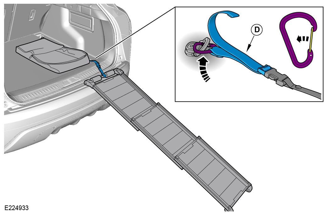 Attach the safety strap (D) to the rearward vehicle loadspace D-loop anchor point.